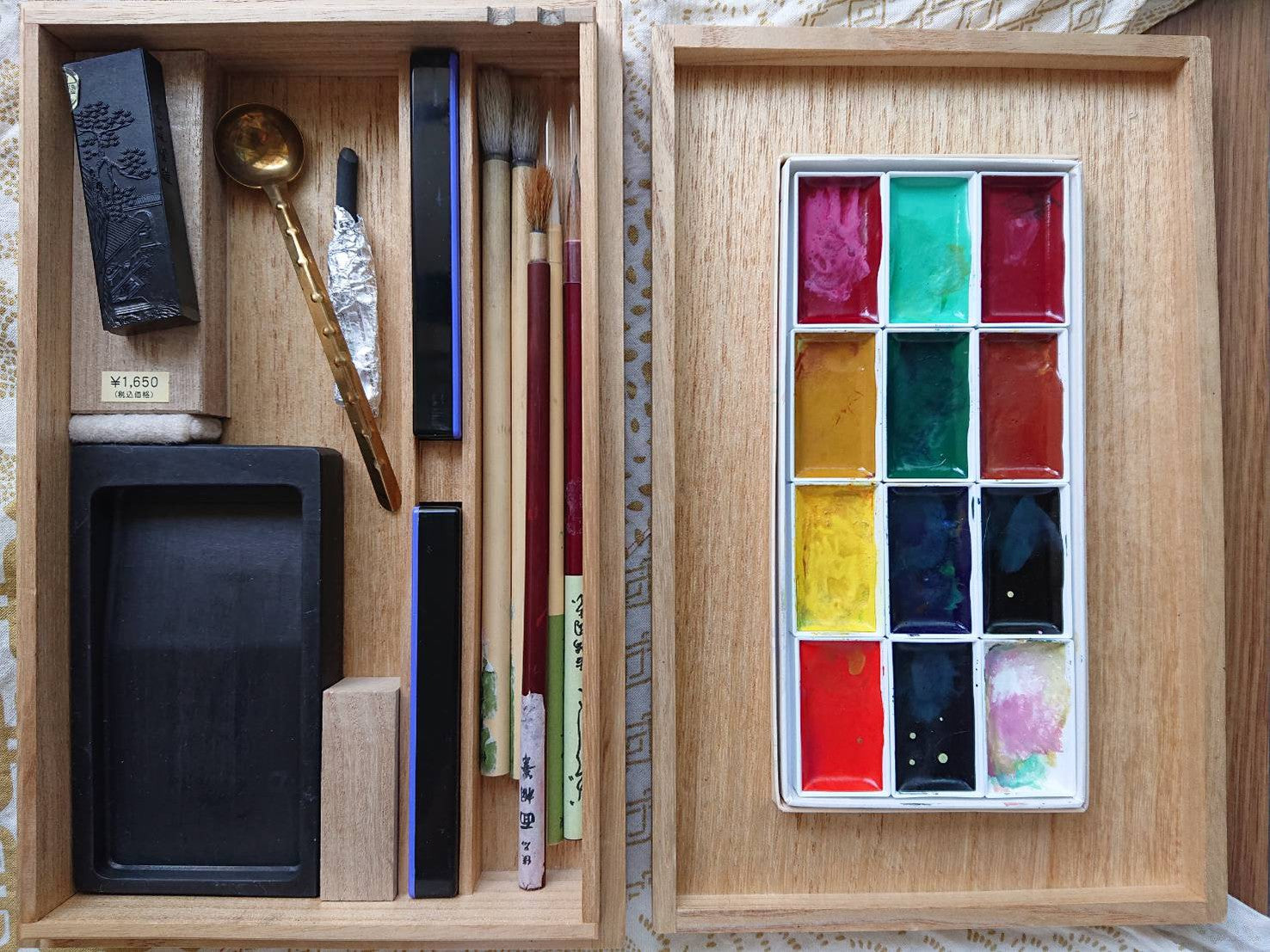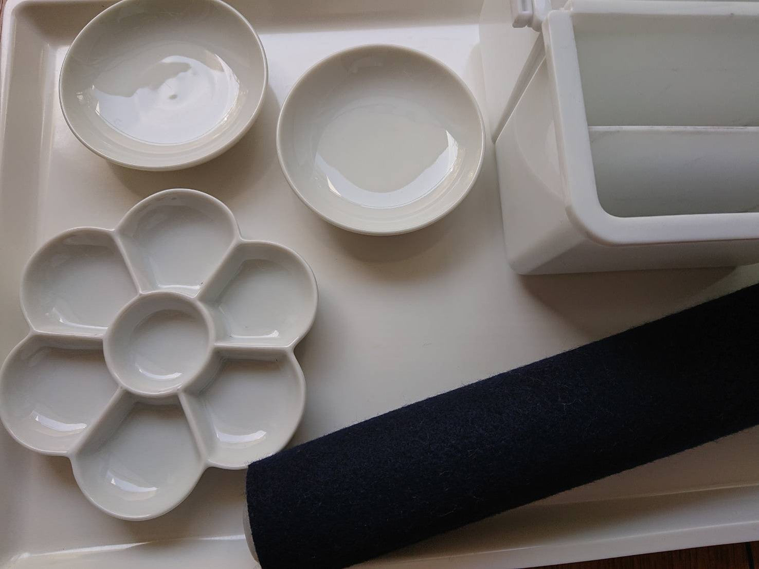 ※墨、硯、筆(彩色用の大中小、面相筆、賛書筆の5本)、筆洗い、文鎮、木炭、彩色用絵具、絵具皿、練習用半紙、下敷き