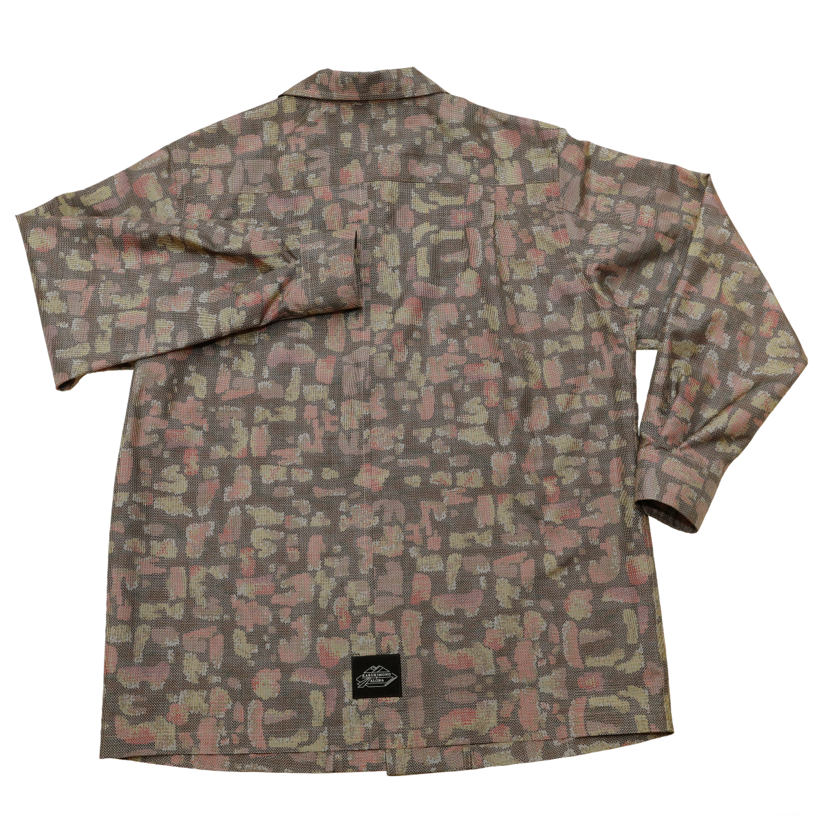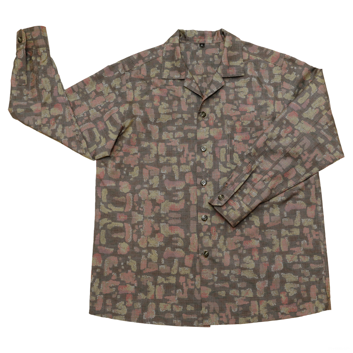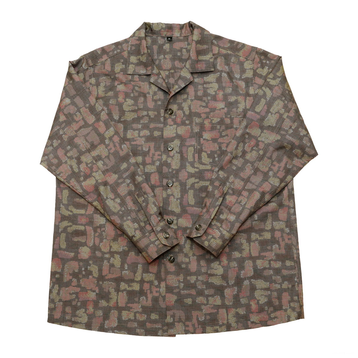 上質な大島紬で作った開襟の一点ものの長袖シャツ。グレー・ピンク・黄色のモザイク柄の織で全体的にはグレーに見える上品な長袖シャツです。背・脇・袖ぐりを折り伏せ縫いできれいに仕立ております。ボタンはそれぞれのシャツに合わせて付けております。