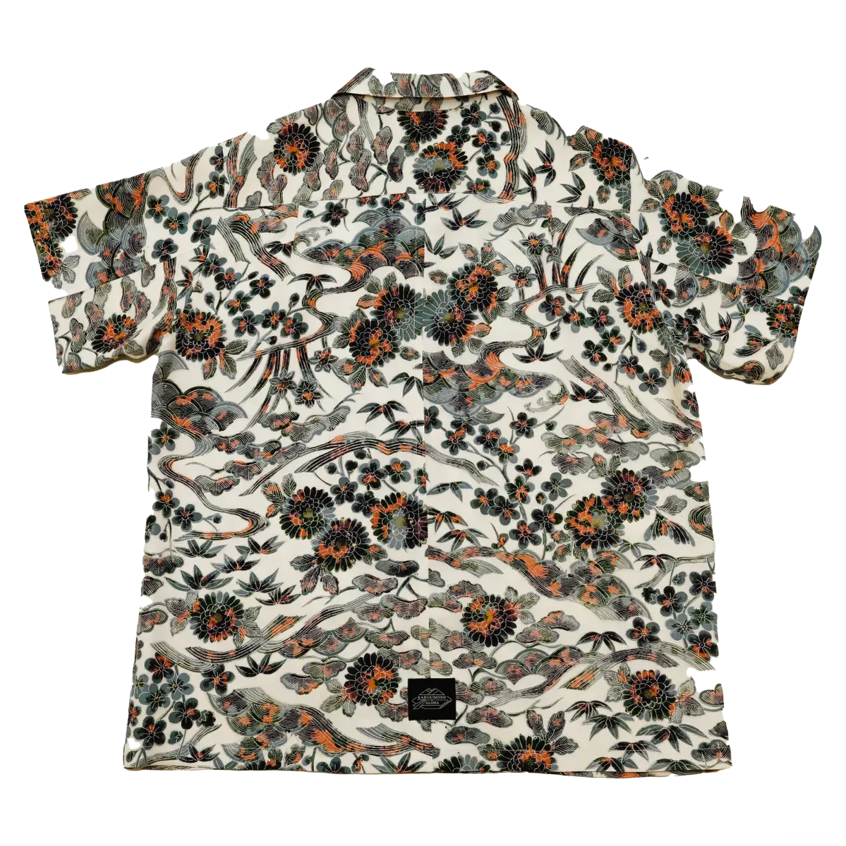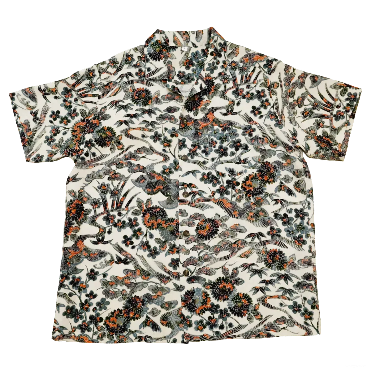 残念ながら今の日本では着物を着る方が一部の方だけになり、着物を簡単に処分する方もたくさん増えています。私たちは日本の大切な文化を残していきたいと考え昔に立ち戻り、ヴィンテージ着物でアロハシャツを仕立て、どなたでも手に取って気軽に着ていただきたいと考えました。 着物を一つ一つ糸を解いて、丁寧に洗い、今の時代に合うよう図柄合わせを綿密に考え、裏に縫い目が出ないように折り伏せ縫いで縫製いたしました。 絹で作られたアロハシャツはとても風合いがよく柔らかで、身体に馴染む大変着心地の良いアロハシャツに仕上がりました。また着物の柄ゆきは品格があり、エレガントな雰囲気を醸し出します。