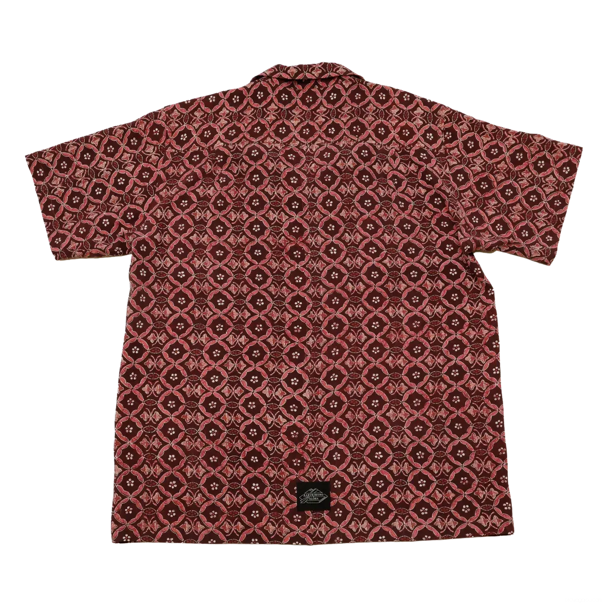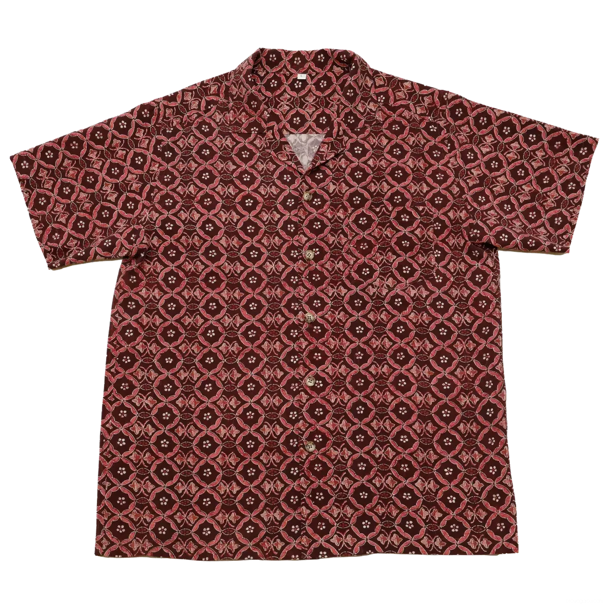 ビンテージの小紋の着物で作った一点もののアロハシャツです。地色は濃いえんじ色でピンクと白の七宝柄に似たモチーフです。背・脇・袖ぐりは折り伏せ縫いできれいに仕立てております。ボタンはそれぞれのシャツに合わせて付けております。