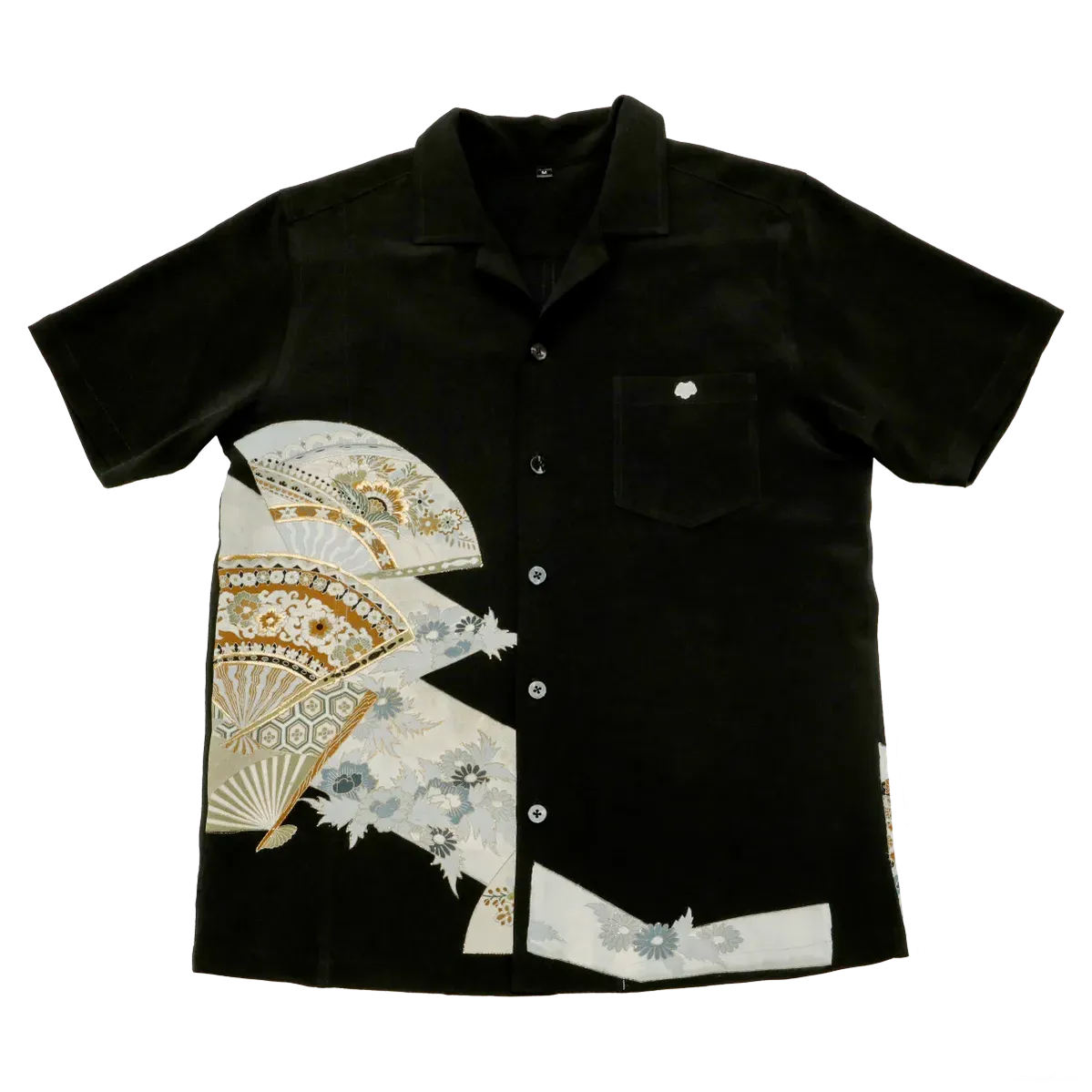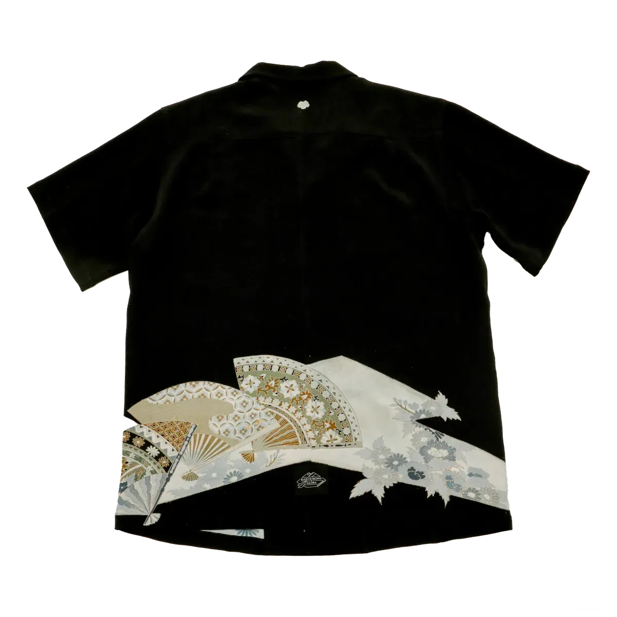 ビンテージの留袖で作った一点もののアロハシャツです。淡いグレーの扇面に金糸で刺繍したシックで上品な柄ですが、ちょっと目をひくお薦めのシャツです。背・脇・袖ぐりは折り伏せ縫いできれいに仕立てております。ボタンはそれぞれのシャツに合わせて付けております。